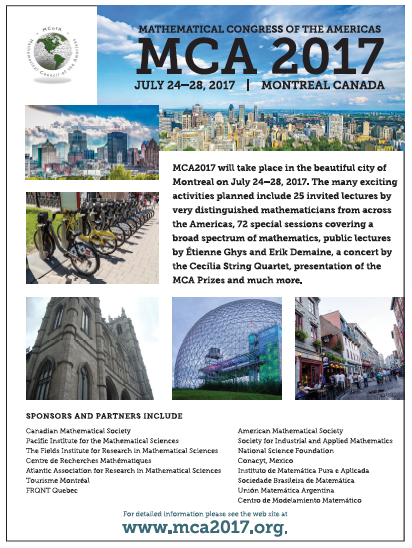 The goal of the Mathematical Congress of the Americas (MCA) is to internationally highlight the excellence of mathematical achievements in the Americas and foster collaborations among researchers, students, institutions and mathematical societies in the Americas.
